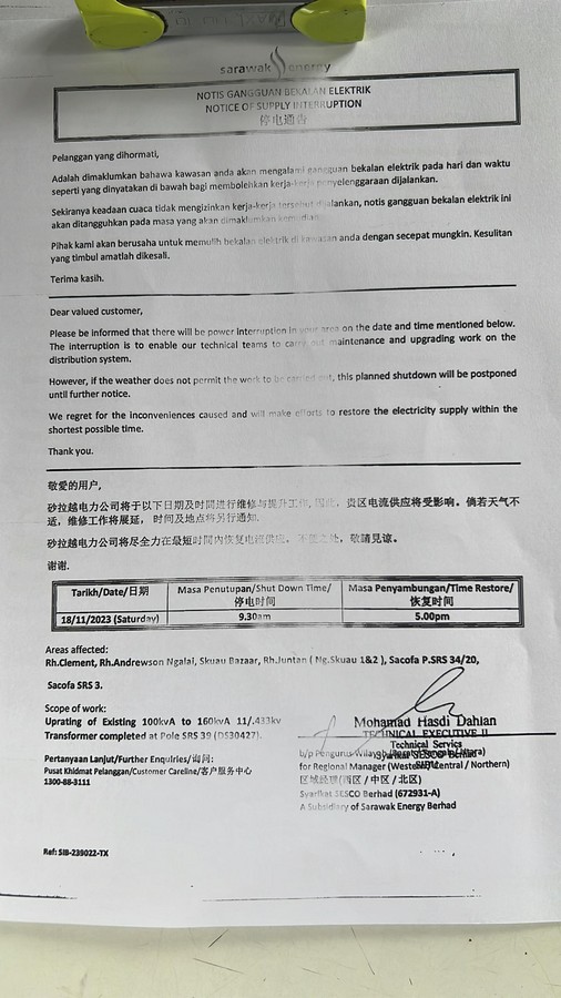 16 November 2023 | Aktiviti TerkiniPEDi Nanga Sekuau akan mengalami gangguan bekalan elektrik pada 18 November 2023(Sabtu). Maklumat lanjut seperti gambar dibawah.